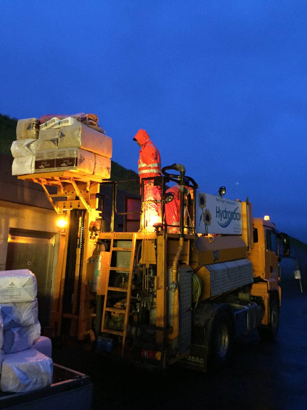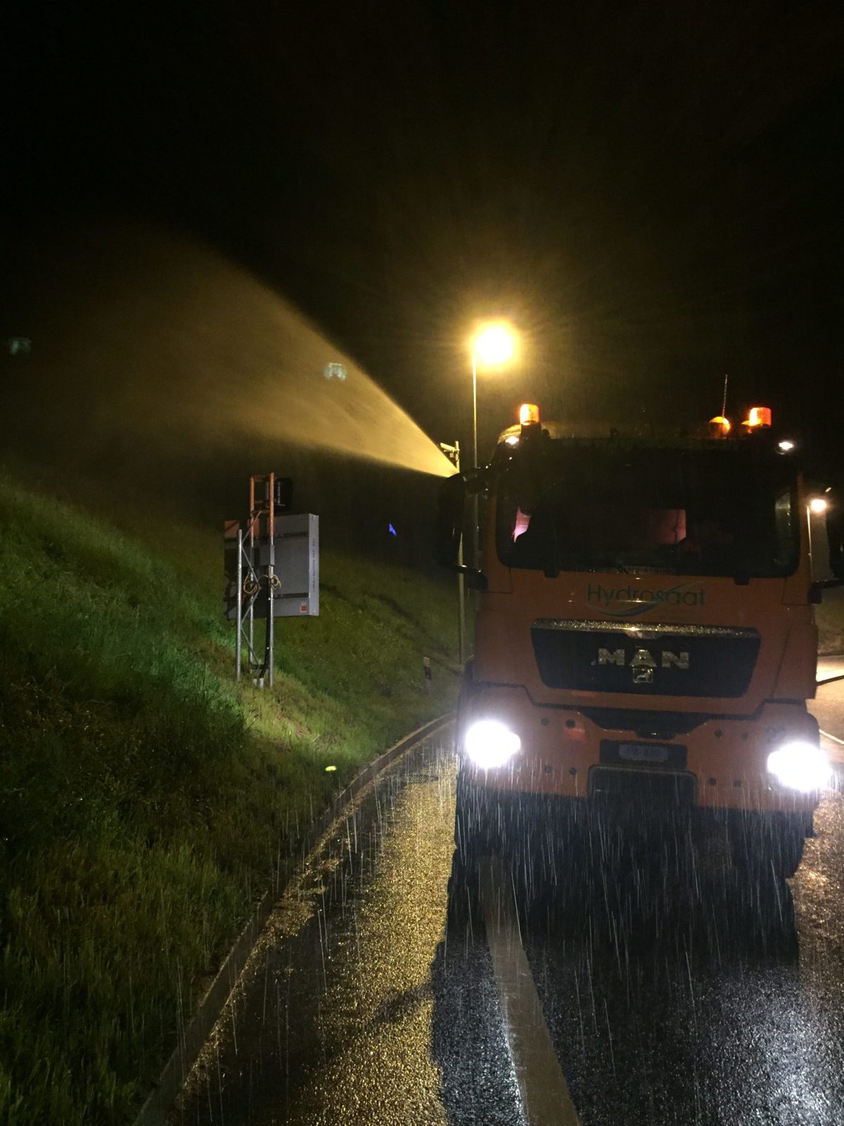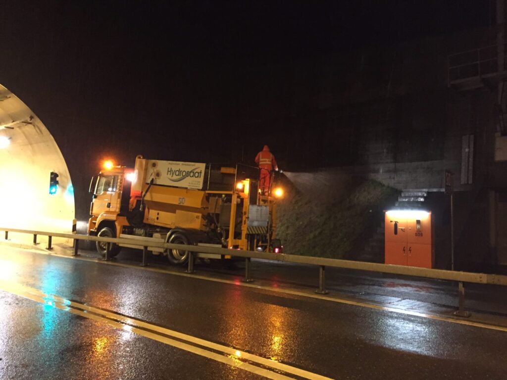 Pour des raisons de sécurité nous avons procédé à un semis hydraulique au bord de cette route très fréquentée à Bulle pendant la nuit.